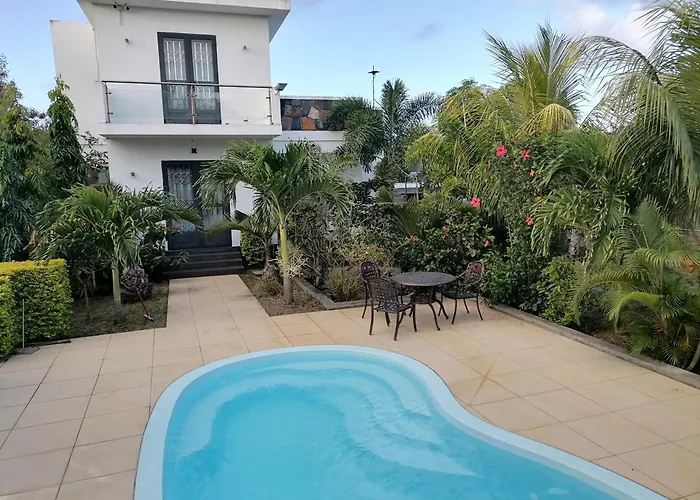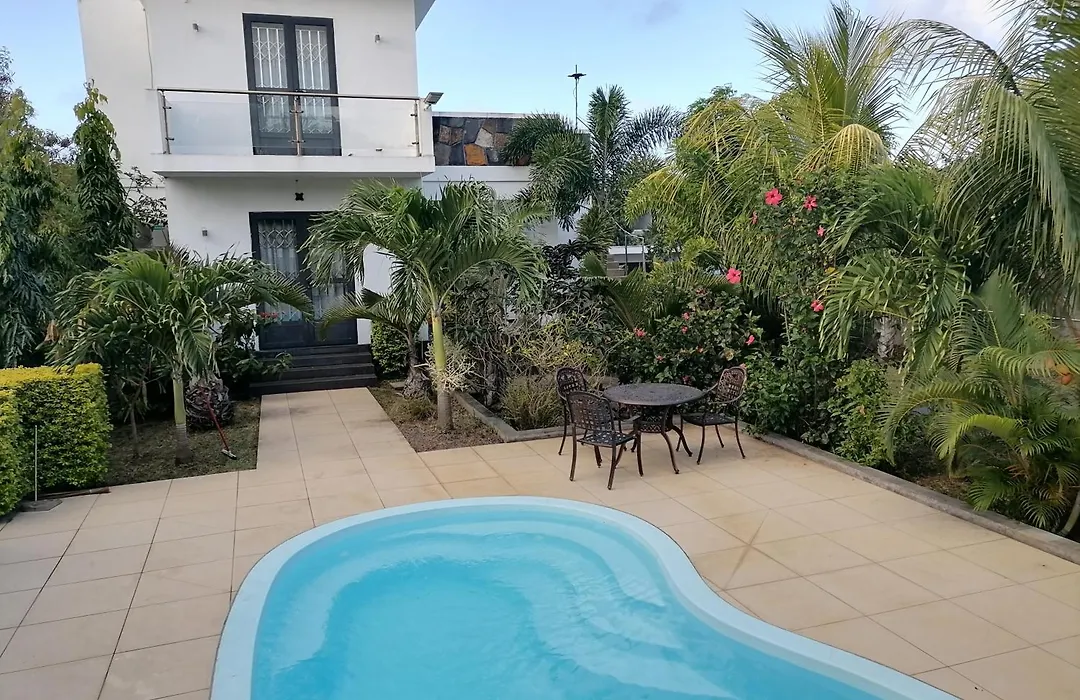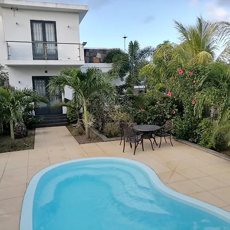 De 2-slaapkamer Kg Lodge Calodye Mauritius Rivière du Rempart ligt op ongeveer 10 minuten met de auto van But A L'herbe Beach en nodigt gasten uit om te ontspannen op een terras.